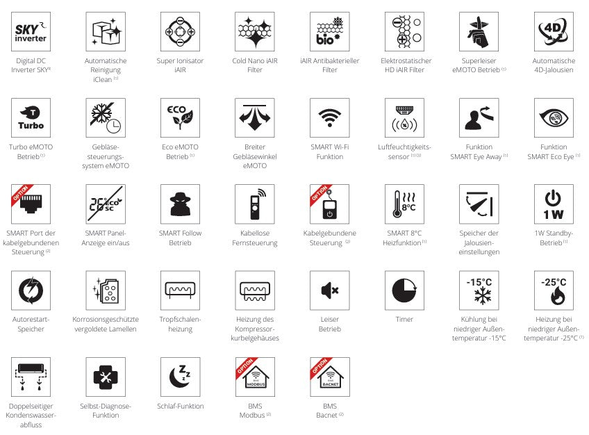 Antibakterieller iAIR und Cold Nano, ergänzt durch einen integrierten Super Ionizer, der Mikroorganismen, Bakterien, Pilze und giftige Stoffe wirksam beseitigt. Die SMART Eye Away-Funktion ist ein intelligenter Sensor („Auge“), der durch Erkennen der menschlichen Aktivität den Luftstromwinkel anpasst, um direkten Luftstrom auf Personen im Raum zu vermeiden.