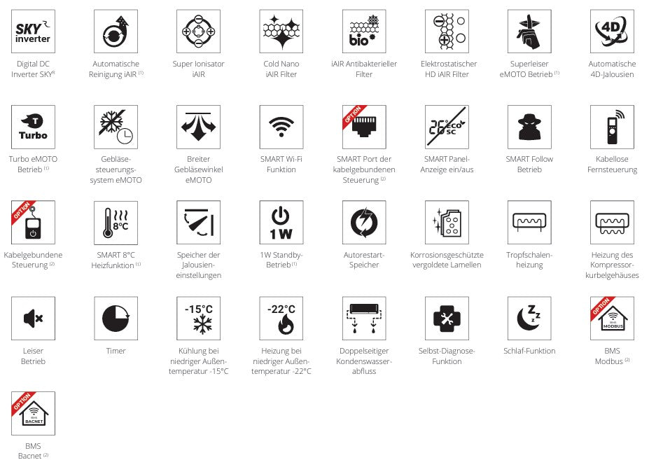 Die verwendete Technologie ermöglicht einen effizienten Betrieb der Klimaanlage auch bei extremen Wetterbedingungen. Auch bei niedrigen Außentemperaturen heizt die Klimaanlage den Raum effektiv.