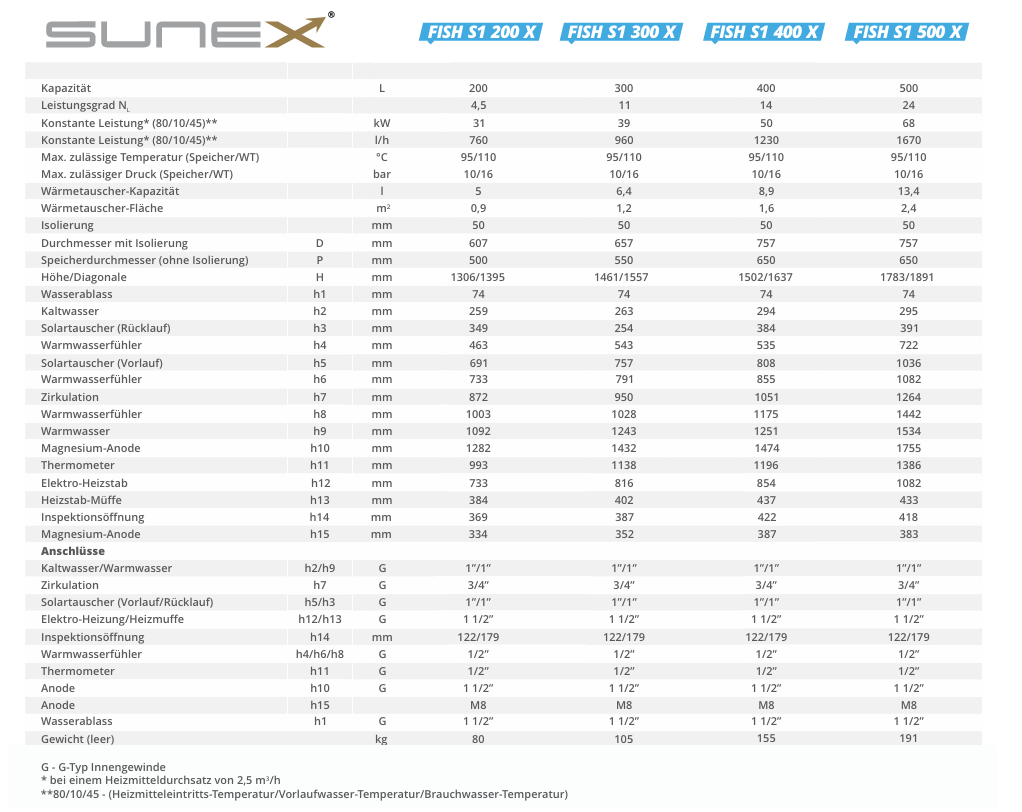 "SUNEX Warmwasserspeicher FISH S1 X 200 bis 500 Liter 1x Wärmetauscher"