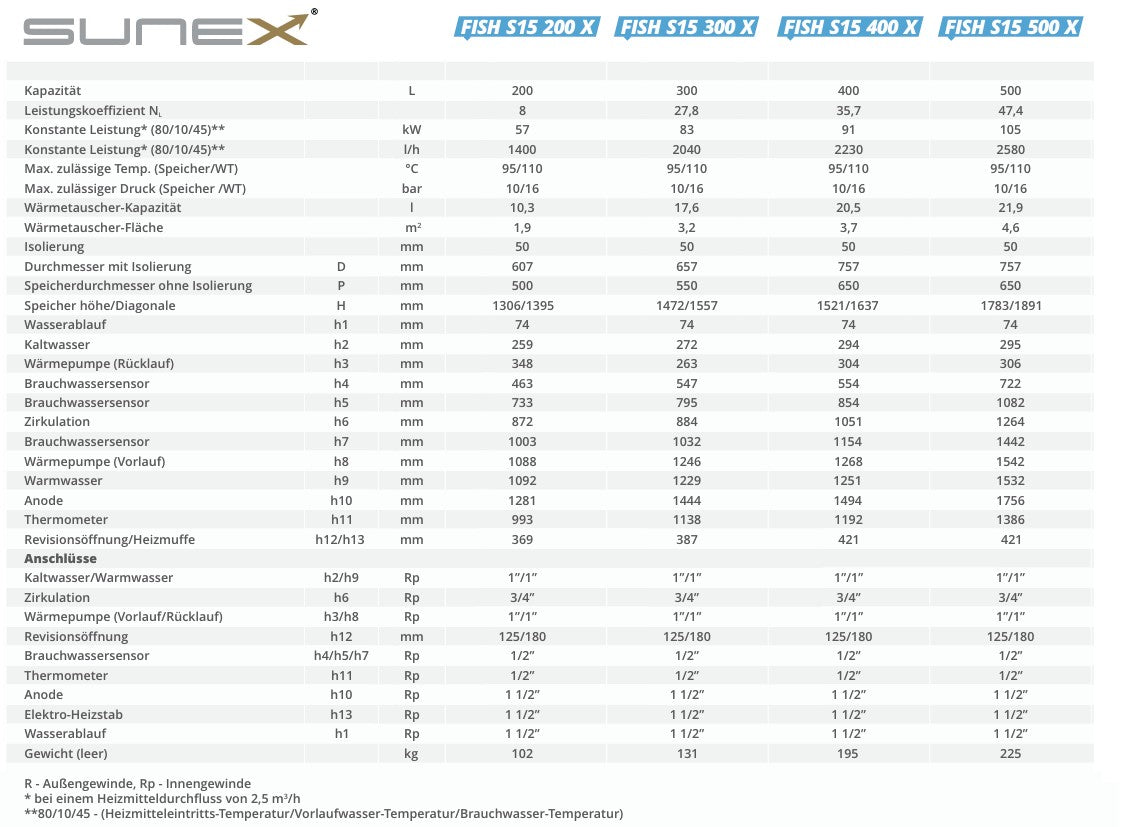 SUNEX Warmwasserspeicher FISH S15 X 200 bis 500 Liter | Hochleistungs Wärmetauscher mit großer Heizfläche | Brauchwasserspeicher für Wärmepumpen